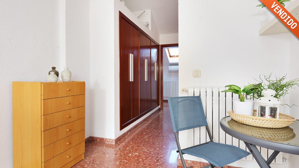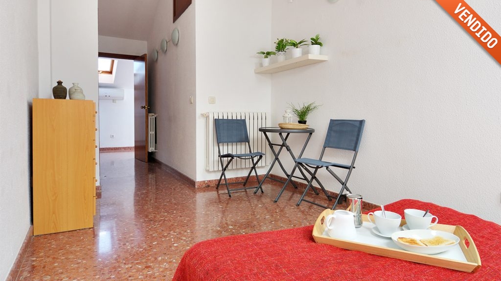 Al entrar a la vivienda, nos encontramos directamente con un amplio salón-cocina de unos 28 m2. Posteriormente pasamos hacia el dormitorio, con armario empotrado, y al baño completo, con bañera. El ático tiene los techos altos, abuhardillados, y cuenta con un total de seis ventanas tipo velux, que aportan una iluminación especial a tu vivienda.